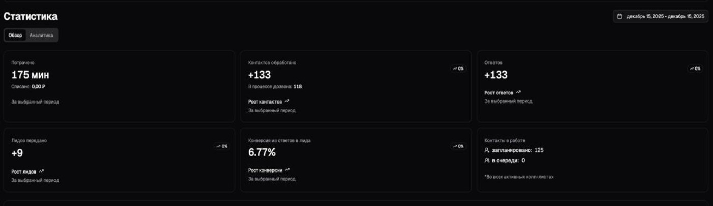 El 94% de los contactos acepta la llamada con éxito (no cuelgan en los primeros 5 segundos). De ellos, aproximadamente el 7–12% se convierten en leads “calientes”, listos para discutir la oferta. Todo depende de tu producto y de tu público objetivo.